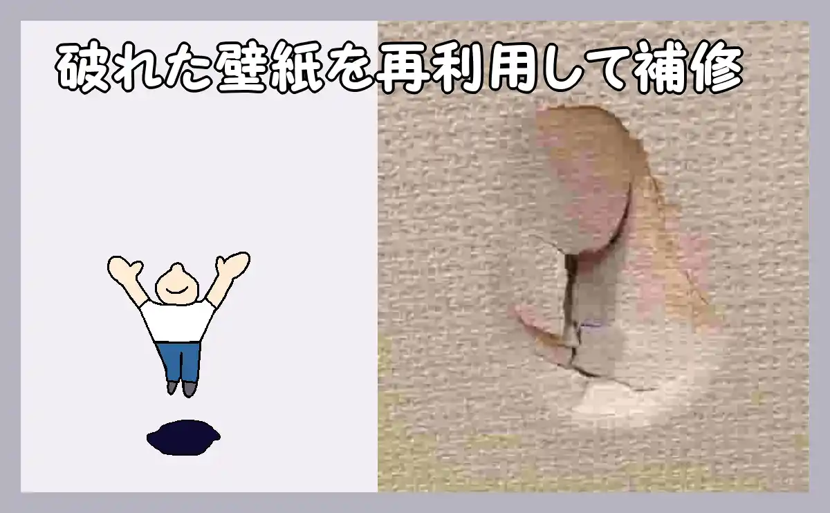 「破れた壁紙を再利用して補修」のアイキャッチです。壁穴補修の際に、「破れた壁紙の再利用」に関する解説です。。